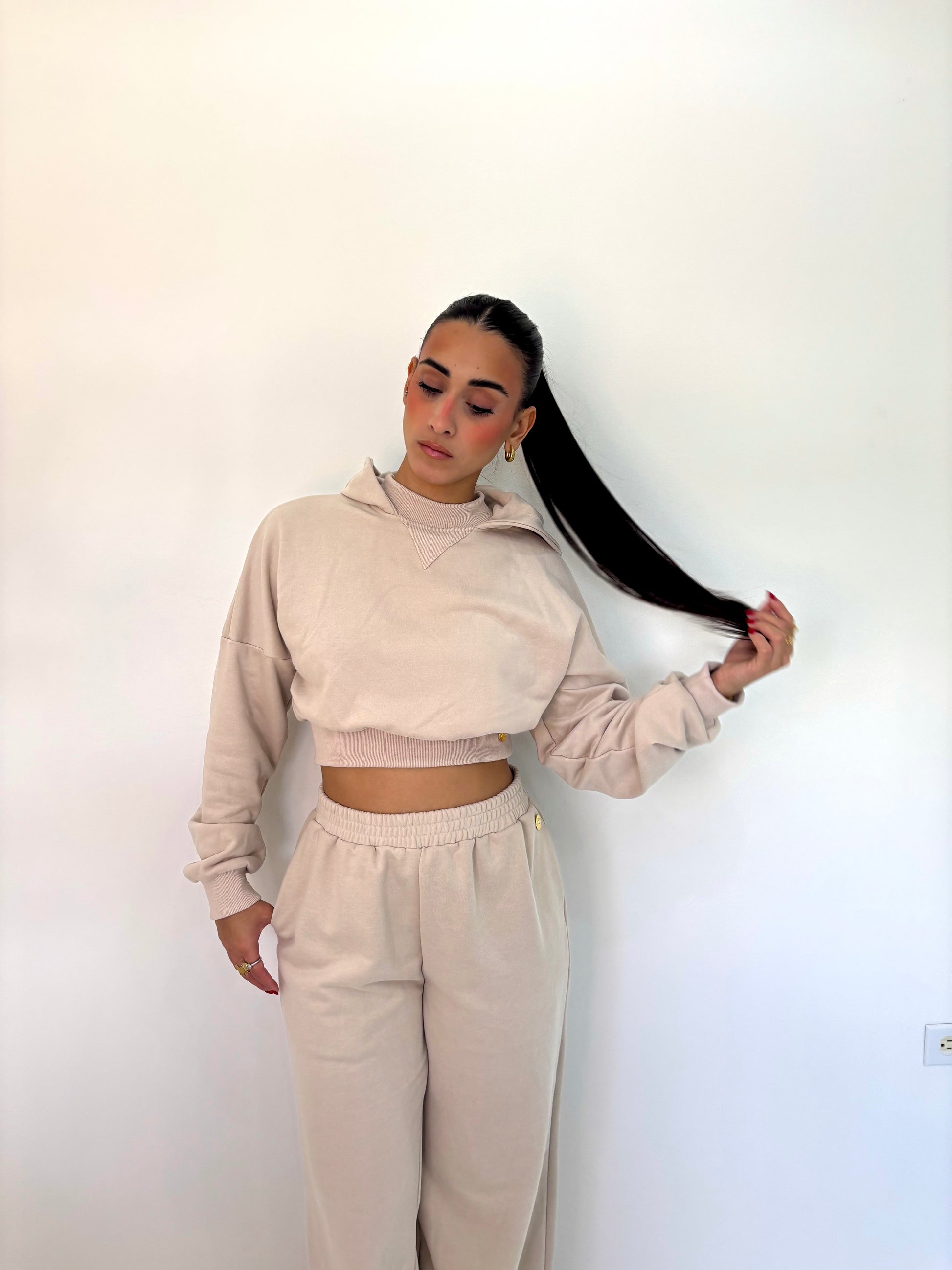 - Hoodie with elastic at the waist and wrists